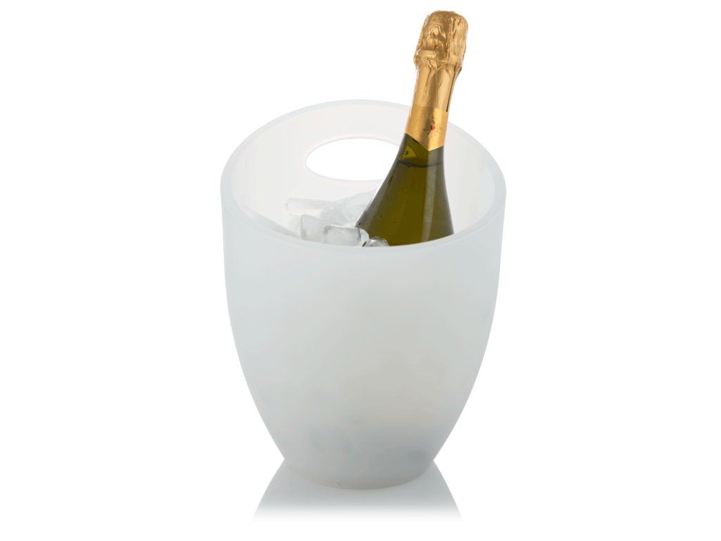 Bílý chladič Igloo je elegantním a praktickým doplňkem pro servírování vína či sektu. Je určen pro jednu lahev, ale lze jej využít také jako kbelík na led. Díky praktické rukojeti se s ním snadno manipuluje a pohodlně přenáší. Povrch s efektem jinovatky působí moderně a atraktivně, zároveň je vhodný pro umístění firemního loga, což z chladiče dělá i skvělý reklamní předmět. Ideální volba pro domácí oslavy, firemní akce i profesionální prostředí restaurací či barů.