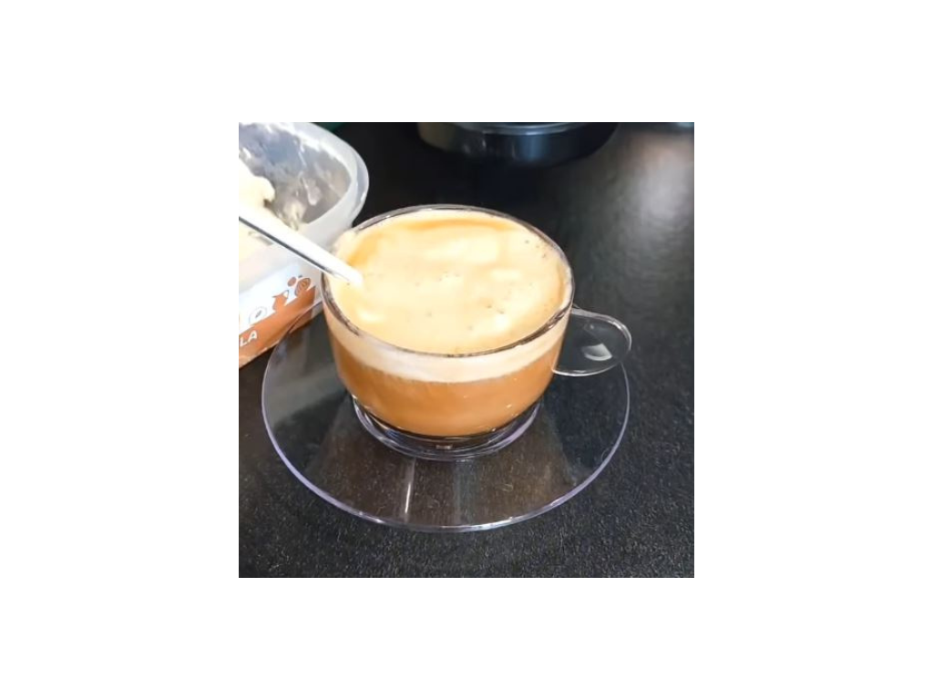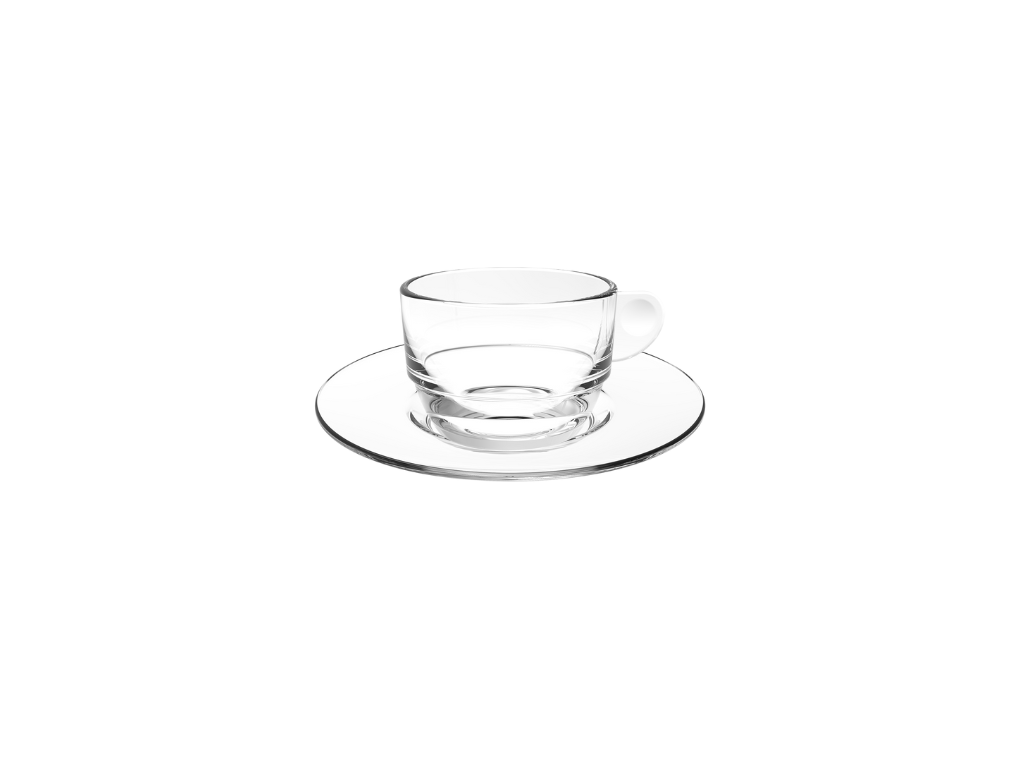 Nerozbitný plastový šálek s podšálkem pro lungo nebo cappuccino, vzhledem imituje sklo. Hrníček s talířkem je také vhodný pro servírování čaje.